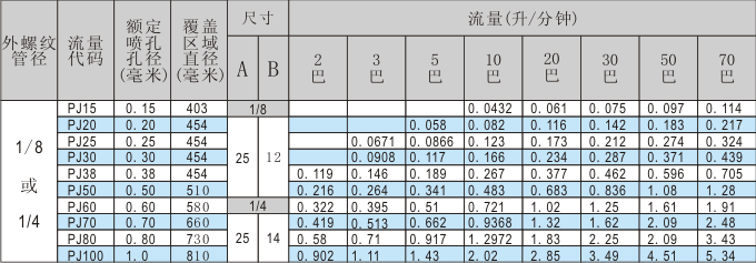 10、流量:0.0580到5.0L/Min C、JM噴嘴流量和尺寸:沖擊形,90度噴霧,1/4管徑,BSP或NPT管螺紋 ,噴嘴整體高度19.1(1/8) 24.6(1/4)毫米 ,噴嘴主體高度11.1(1/8) 14.2(1/4)毫米 ,覆蓋區域直徑203-610毫米 ,額定噴孔直徑0.150-1.00毫米